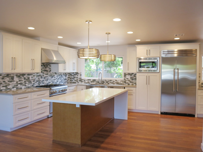 Remodeled kitchen features a large island, apron sink, Quartz countertops, Thermador range, Thermador refrigerator, dishwasher,