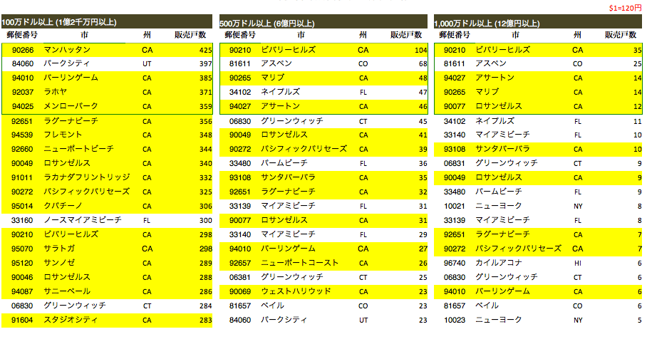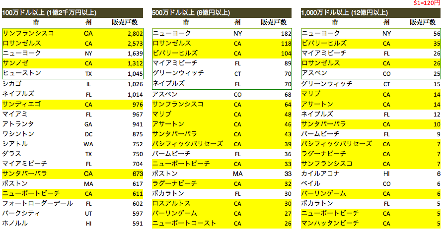 全米で2014年1月1日から2014年12月31日までに売却された高級物件数をお知らせ致します。