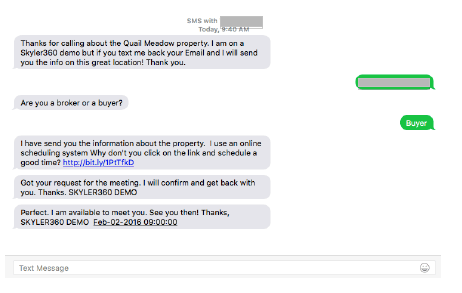 その一つがスカイラー360(Skyler360)である。同ソフトはもともとアパート経営者がテナントのスクリーニングのために開発されたソフトであった。創立者であるロンサッソン氏は「いかにしてアパートに連絡してくる入居資格のなりテナントとの無駄なやり取りを減らすことができるか。」という課題から始まった。その解決法としては必要がなければ一切やり取りしないというものであった。テキストとメールを利用して、AIが自動的に顧客とのやり取りをしてくれる。